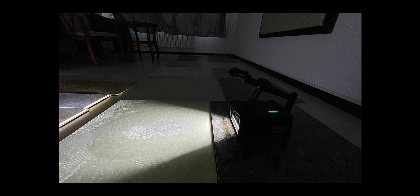 低角度掠射与漫反射配光结合,显现足迹的同时弱化足迹背景花纹干扰,突出足迹本身。